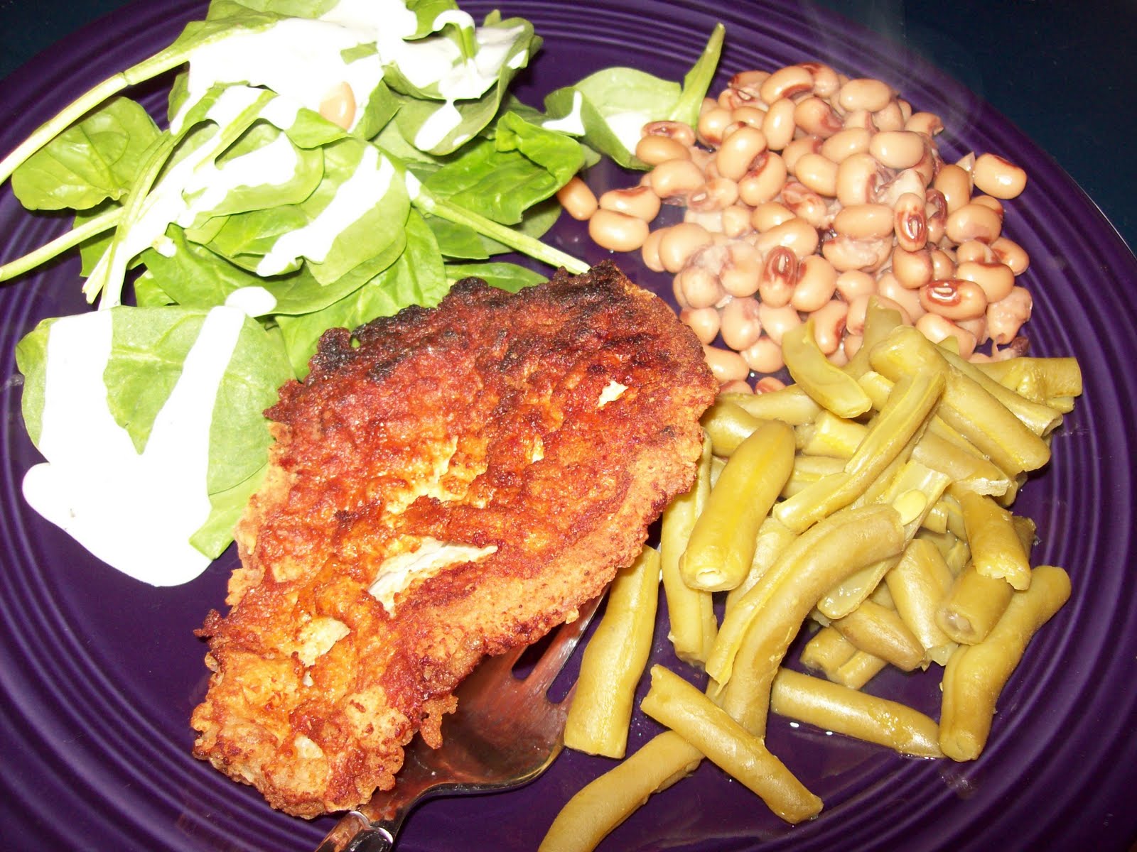 Mix dry ingredients really well. Dip chops into egg, then dry mix. Cook in hot oil on stove for 6-8 minutes per side. Serve with spinach salad, green beans, and black eyed peas. If you wanna. :)